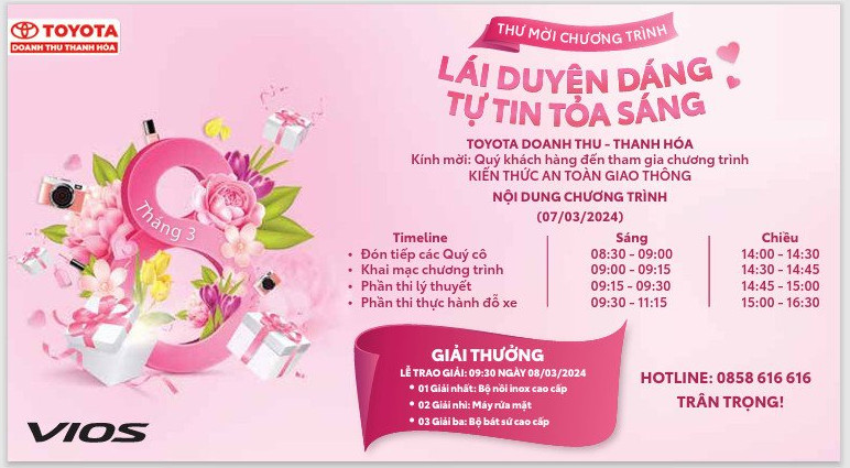 - Lái duyên dáng - Tự tin tỏa sáng: Nhận ngay Voucher chăm sóc và làm đẹp xe trị giá 500,000 VNĐ cho Quý khách hàng nữ mang xe đi bảo dưỡng và sửa chữa từ ngày 01/03/2024 đến ngày 07/03/2024 ( với điều kiện khách hàng đến tham gia cuộc thi kiến thức an toàn giao thông và thực hành đỗ xe tại Showroom Toyota Doanh Thu Thanh Hóa vào ngày 7/3/2024, sáng từ lúc 09h00 đến 11h15, chiều từ 14h00 đến 16h30).