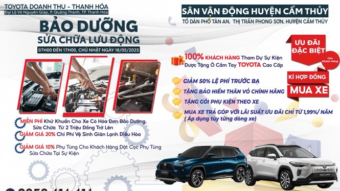 Toyota Doanh Thu - Thanh Hóa kính mời Quý khách hàng tham gia sự kiện bảo dưỡng, sửa chữa lưu động và lái thử xe tại Huyện Cẩm Thủy vào chủ nhật, Ngày 18/05/2025