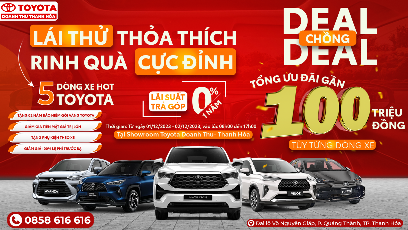 Toyota Doanh Thu- Thanh Hóa, Đại lý Toyota lớn nhất tại Thanh Hóa, địa chỉ: Đại Lộ Võ Nguyên Giáp, Phường Quảng Thành, Thành Phố Thanh Hóa kính mời quý khách tham gia sự kiện lái thử và trải nghiệm Top 5 dòng xe Hot nhất của Toyota tại Showroom Toyota Doanh Thu- Thanh Hóa từ ngày 01/12/2023 đến 02/12/2023