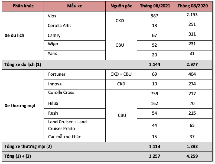 Toyota Việt Nam công bố tổng doanh số bán hàng trong tháng 08/2021 đạt 2.304 xe (bao gồm xe Lexus), giảm 47% so với cùng kỳ năm trước trong khi tổng thị trường giảm 54% (tháng 08/2020) do ảnh hưởng bởi dịch Covid-19.