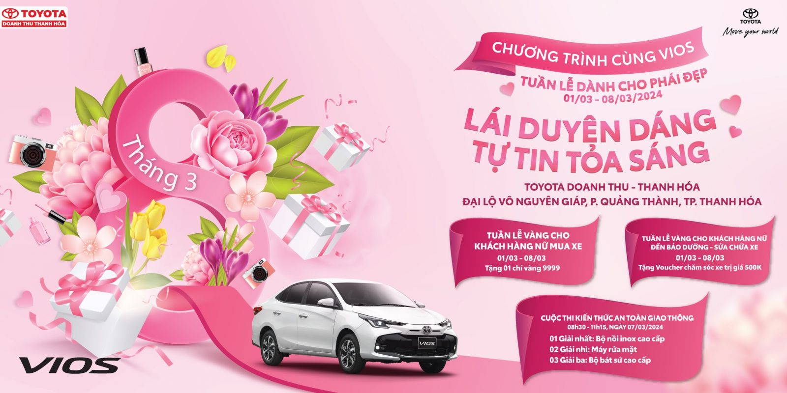 Nhân ngày 08/3 Toyota Doanh Thu - Thanh Hóa mong muốn lan tỏa tình yêu và sự trân trọng đến phái đẹp thông qua chương trình “Tuần Lễ Dành Cho Phái Đẹp” diễn ra từ ngày 01/03 đến 08/03/2024. Đây không chỉ là cơ hội để tôn vinh những người phụ nữ trong cuộc sống của chúng ta mà còn là dịp để họ được trải nghiệm những ưu đãi đặc biệt và sự chăm sóc đầy yêu thương từ Toyota Doanh Thu - Thanh Hóa.