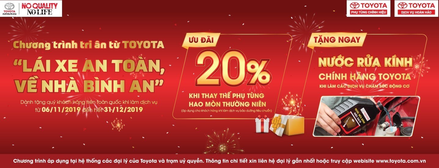 Toyota Việt Nam thực hiện chương trình tri ân “Lái xe an toàn, về nhà bình an” trong thời gian từ ngày 06/11/2019 đến hết 31/12/2019, dành cho khách hàng sử dụng xe Toyota khi làm dịch vụ bảo dưỡng tiêu chuẩn tại các Đại lý Toyota và trạm dịch vụ ủy quyền trên toàn quốc.