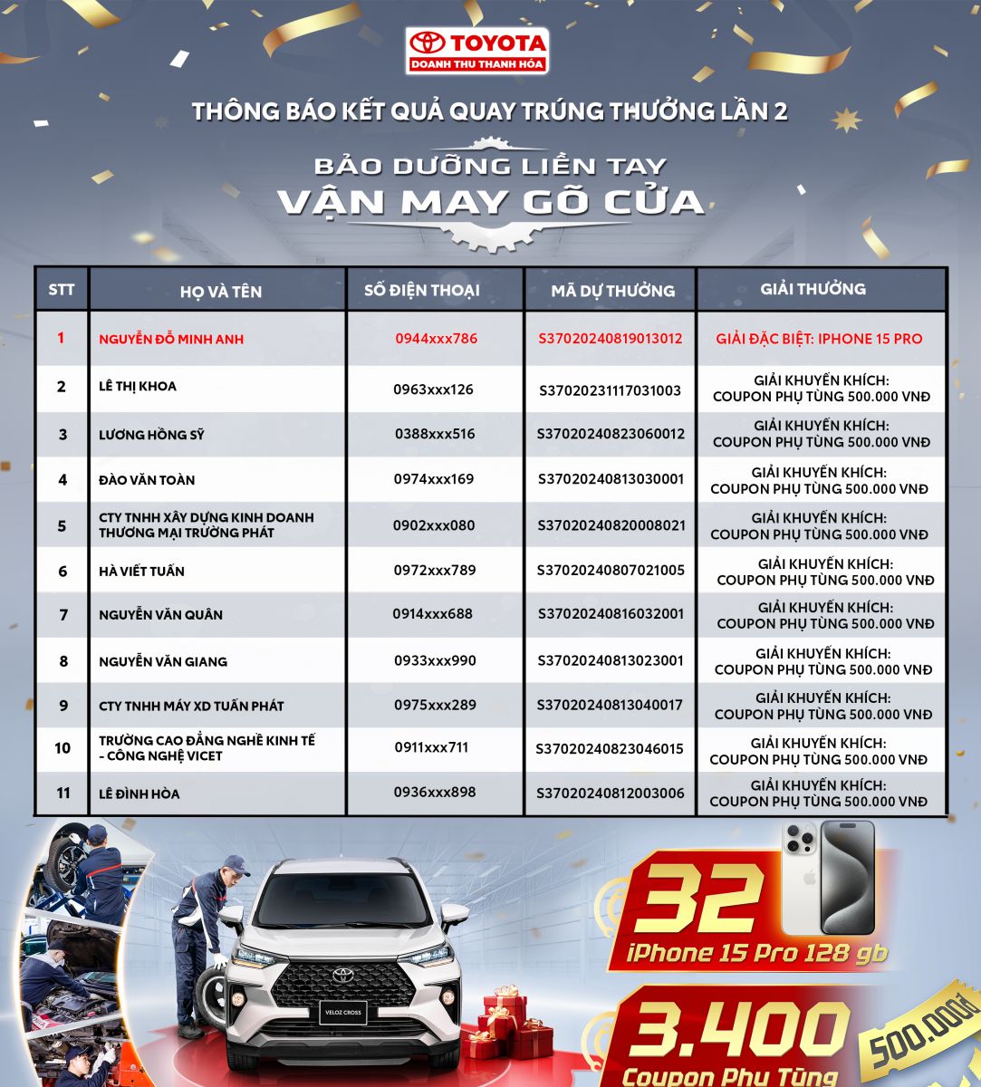 Đồng thời cũng xin được chúc mừng 10 khách hàng may mắn trúng thưởng Coupon phụ tùng trị giá 500.000đ trong chương trình “Bảo dưỡng liền tay – Vận may gõ cửa” đợt 2 áp dụng cho khách hàng đến làm Dịch Vụ tại Toyota Doanh Thu- Thanh Hóa từ ngày 01/08/2024 ngày đến ngày 27/08/2024