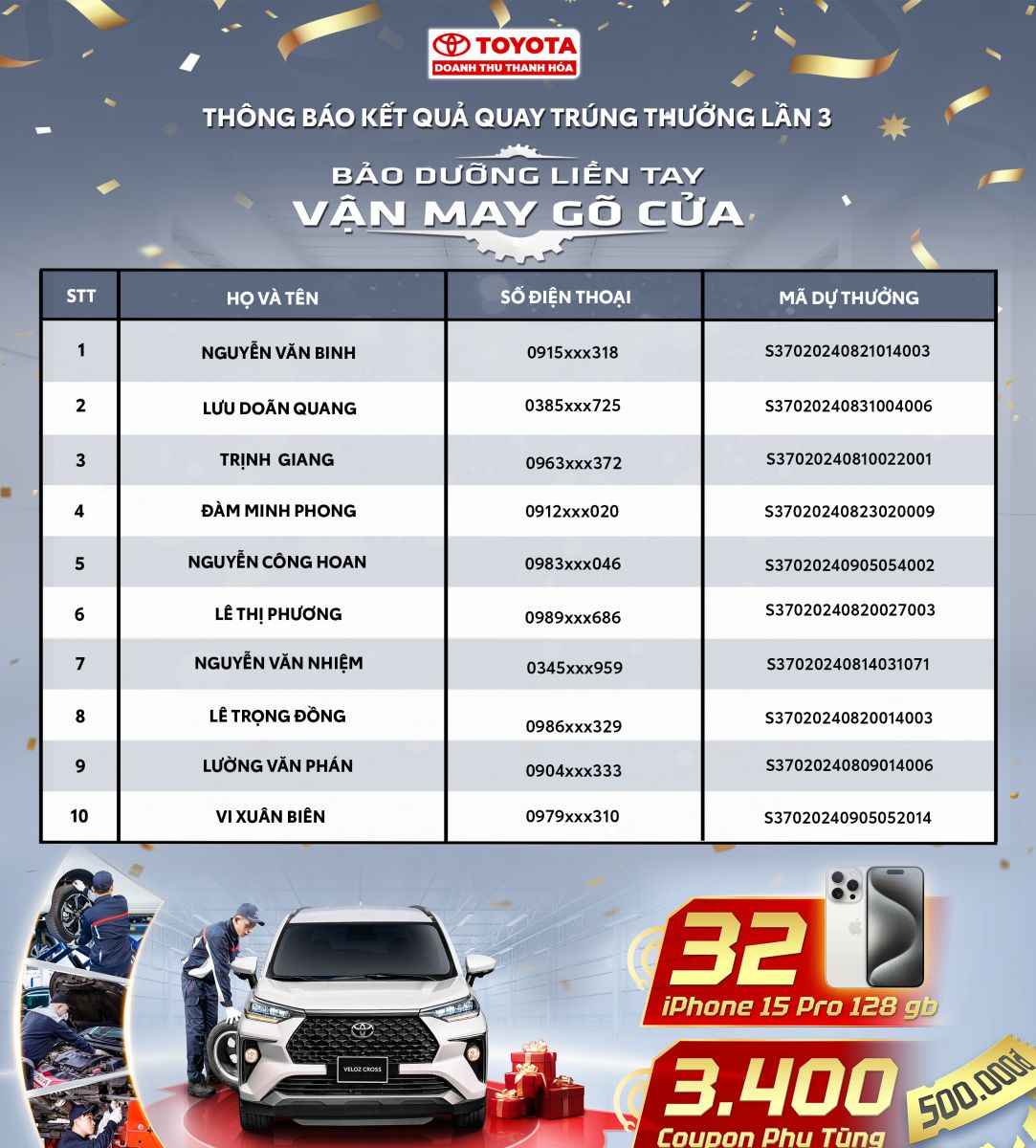 Toyota Doanh Thu- Thanh Hóa xin chúc mừng 10 khách hàng đã may mắn trúng thưởng chương trình “Bảo dưỡng liền tay – Vận may gõ cửa” đợt 3 áp dụng cho khách hàng đến làm Dịch Vụ tại Toyota Doanh Thu- Thanh Hóa từ ngày 01/8/2024 đến ngày 13/09/2024 .