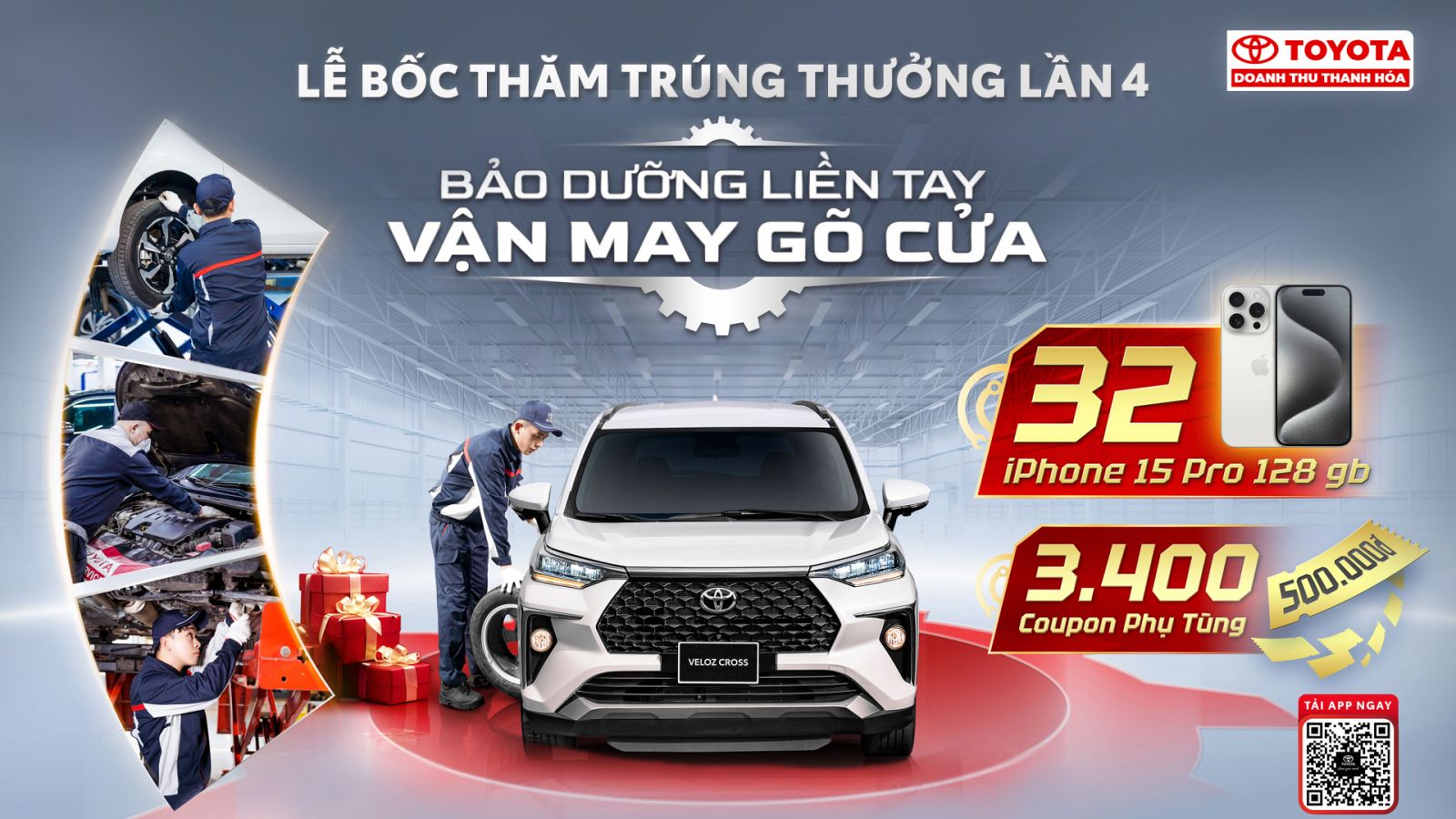 Chương trình " Bảo dưỡng liền tay- Vận may gõ cửa" được diễn ra từ ngày 01/08/2024 - 30/09/2024 với 4 đợt quay số trúng thưởng. Khi khách hàng đến làm dịch vụ tại Toyota Doanh Thu- Thanh Hóa có hóa đơn từ 500,000đ trở lên sẽ nhận được một (01) mã dự thưởng chương trình, tổng mã dự thưởng của khách hàng là bội số của 500,000 (phần nguyên). Ví dụ, khách hàng có hóa đơn thanh toán đã bao gồm thuế giá trị gia tăng là 1,800,000 VNĐ sẽ nhận được ba (03) mã dự thưởng chương trình;