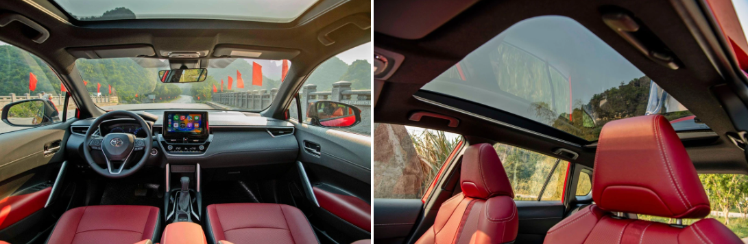 Không gian nội thất màu đỏ và đen cùng kính trần toàn cảnh trên Corolla Cross phiên bản xăng.