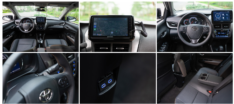 Khoang cabin của Toyota Vios mới sở hữu nhiều trang bị tiện nghi như: màn hình trung tâm 9 inch, vô lăng bọc da 3 chấu, hàng ghế 2 có khả năng gập 6/4 để gia tăng khoang hành lý, điều hòa tự động 2 vùng trên bản cao cấp và chỉnh tay trên bản cơ sở, đồng hồ Analog được thay thế bằng cụm đồng hồ Optitron hiện đại hơn,…