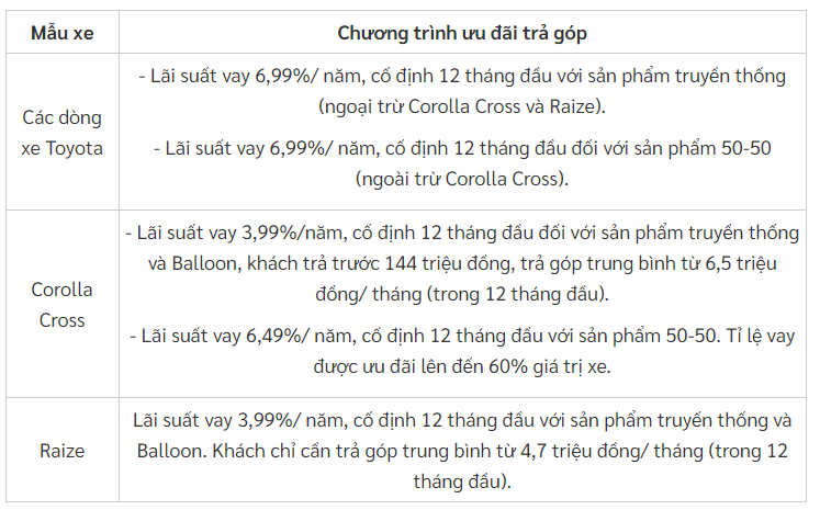 Ngoài chương trình khuyến mãi trên, Công ty Tài chính Toyota Việt Nam – TSFVN cũng có hỗ trợ dành cho khách hàng mua xe Toyota trả góp. Cụ thể, như sau: