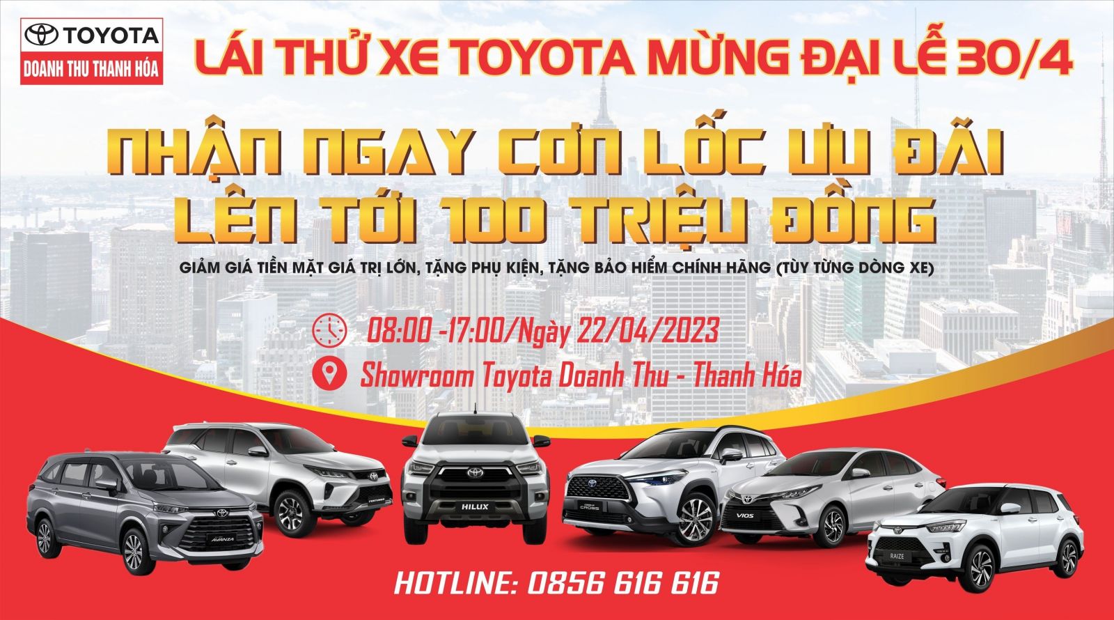 Toyota Doanh Thu- Thanh Hóa., Đại lý Toyota lớn nhất tại Thanh Hóa, tọa lạc tại địa chỉ: Đại Lộ Võ Nguyên Giáp, Phường Quảng Thành, Thành Phố Thanh Hóa kính chào quý khách. Tưng bừng chào mừng Đại Lễ 30/4 Toyota Doanh Thu- Thanh Hóa kính mời quý khách tham gia sự kiện lái thử xe cùng Đại lý: