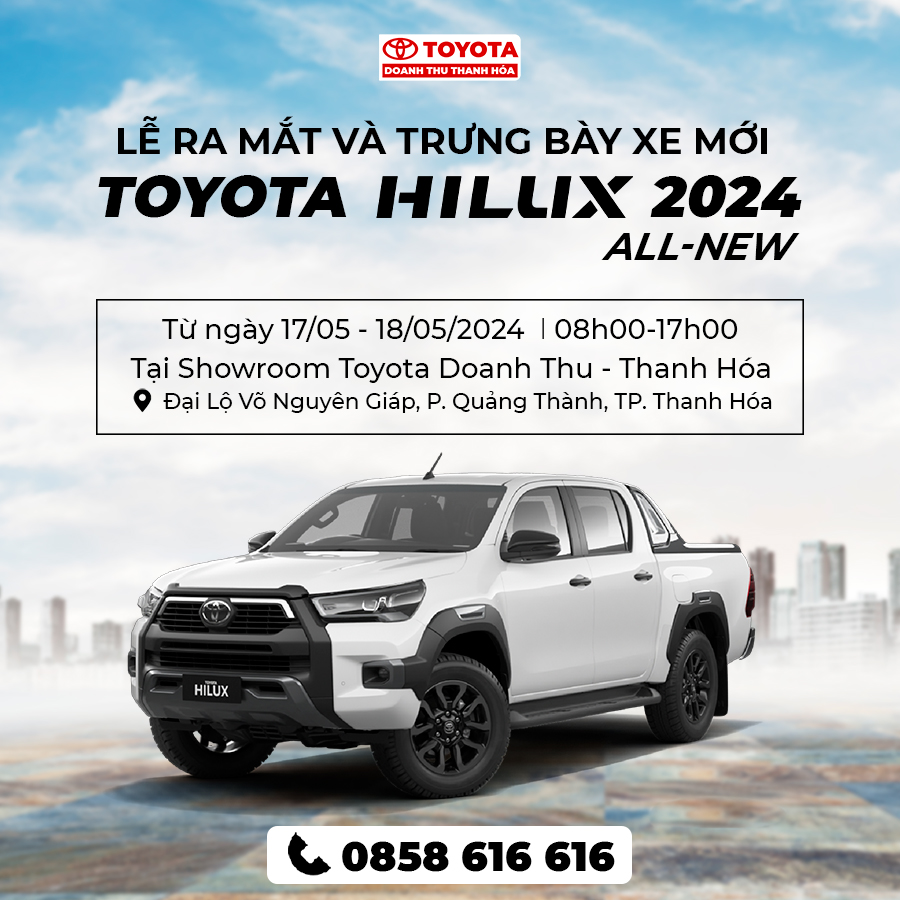 Toyota Hilux 2024 All- New - Huyền thoại bán tải đã trở lại . Đừng bỏ lỡ sự kiện “Lễ ra mắt và trưng bày xe Toyota Hilux 2024 All- New” diễn ra tại Toyota Doanh Thu- Thanh Hóa từ ngày 17/5/2024 đến ngày 18/5/2024 vào lúc 08h00 đến 17h00