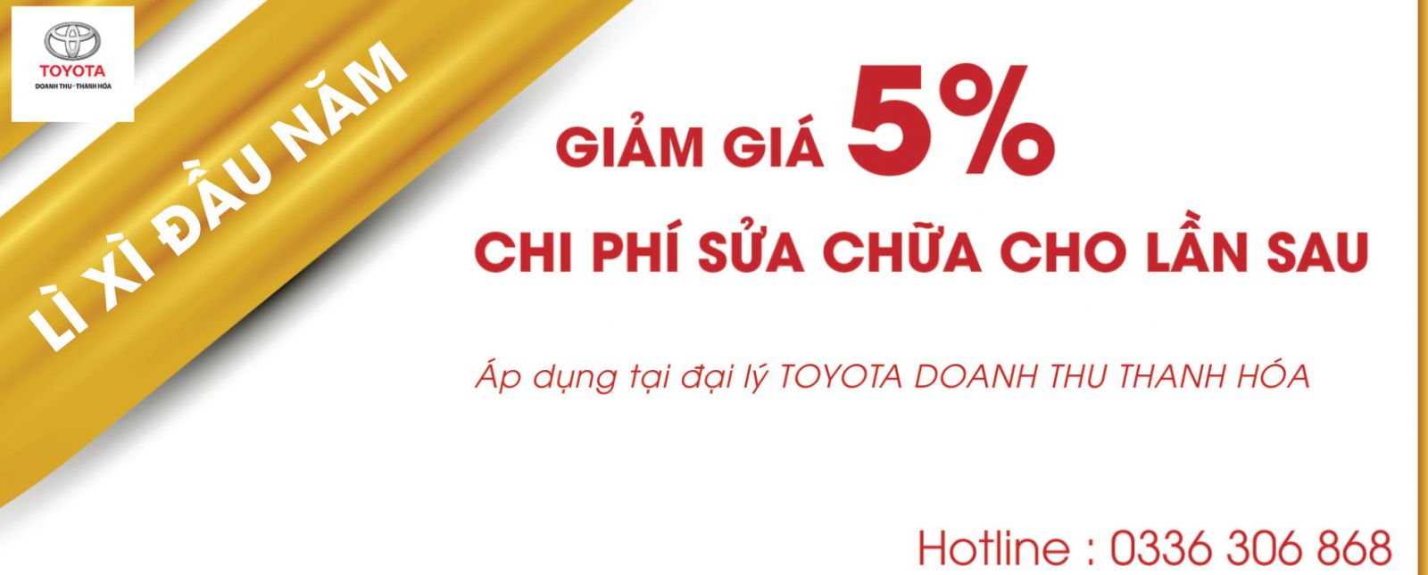 Nhằm tri ân khách hàng, Toyota Doanh Thu- Thanh Hóa Lì Xì Đầu Năm tặng ngay Voucher giảm giá 5% chi phí sửa chữa cho lần sau. Áp dụng cho 100 khách hàng đầu tiên khi đến làm dịch vụ tại Toyota Doanh Thu- Thanh Hóa