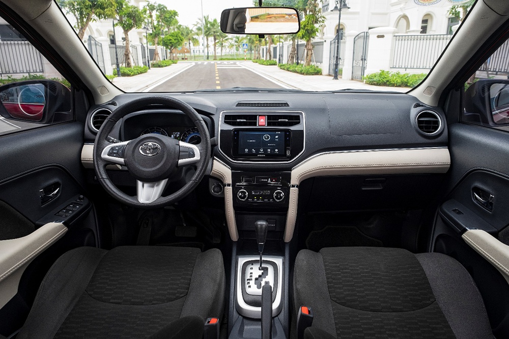 Rush sở hữu không gian nội thất bố trí cho 7 người ngồi trên xe, ngoài ra hàng ghế thứ 2 và thứ 3 sử dụng linh hoạt để tạo ra không gian lớn cho việc chở đồ. Điều hòa tự động 2 giàn lạnh với hiệu quả làm mát tối ưu cho mọi vị trí ngồi. Toyota Rush được thiết kế tiện ích với màn hình cảm ứng 7 inch kết nối điện thoại thông minh, 13 hộc để đồ tiện lợi, cổng sạc 12V cho cả hai hàng ghế sau, hệ thống âm thanh 8 loa sống động,…
