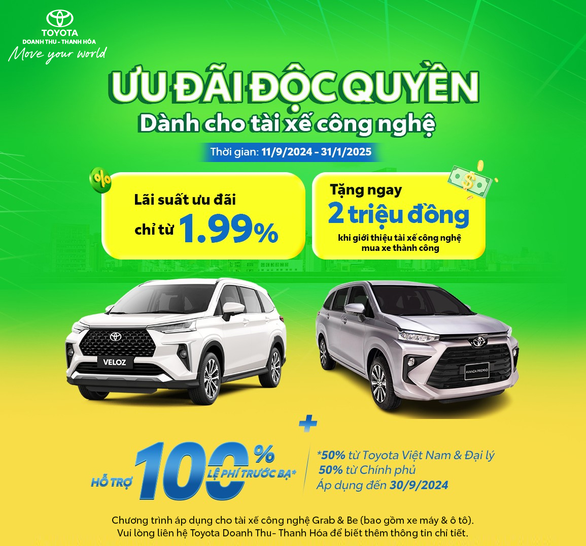 Bên cạnh đó, tài xế công nghệ giới thiệu thành công bạn bè, người quen là tài xế công nghệ Grab và Be mua xe Veloz Cross hoặc Avanza Premio sẽ nhận được 2 triệu đồng tiền mặt đối với mỗi giao dịch mua xe thành công tại Toyota Doanh Thu- Thanh Hóa