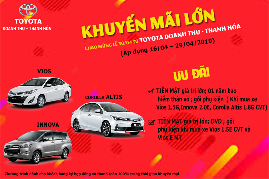 Chào mừng 2 ngày lễ lớn của cả nước, đại lý Toyota Doanh Thu - Thanh Hóa triển khai chương trình KHUYẾN MÃI LỚN dành cho khách hàng mua xe trong thời gian từ 16/04/2019 – 29/04/2019. Quý khách hàng đang quan tâm và có nhu cầu mua xe nhanh tay gọi điện ngay tới số Hotline: 0856.616.616 để được tư vấn và đặt lịch tham quan, lái thử xe tại đại lý Toyota Doanh Thu – Thanh Hóa.