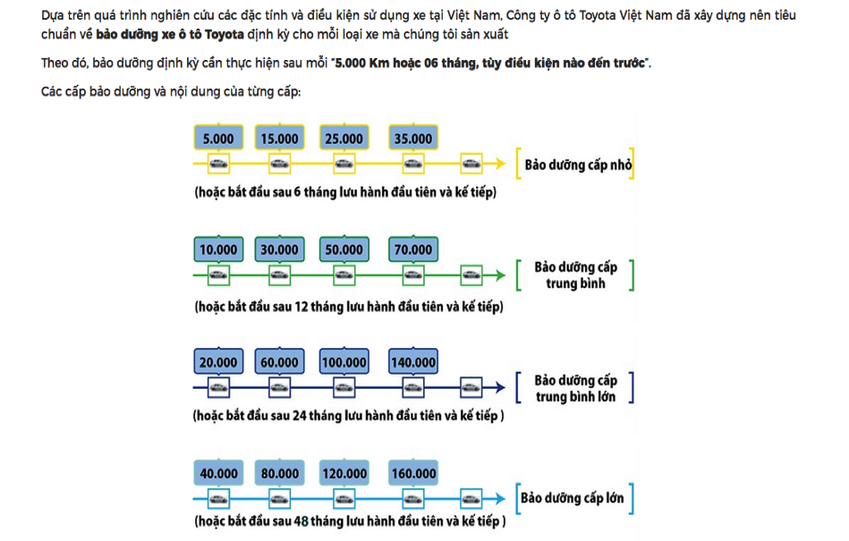 Suốt vòng đời sử dụng, Toyota chia nhỏ chi phí dịch vụ chăm sóc xe theo 4 cấp bảo dưỡng từ nhỏ/trung bình/trung bình lớn và lớn, theo mốc 6/12/24 và 48 tháng mỗi kỳ. Khác với cách tính chi phí trọn gói theo khoảng 10.000km lũy tiến chi phí như các hãng khác, chi phí và giá bảo dưỡng Fortuner ở 3 cấp nhỏ và trung bình lại rất “rẻ”, chỉ vài trăm ngàn tới 1,3 triệu cho cả quãng thời gian sử dụng xe kéo dài (trừ cấp bảo dưỡng lớn, khoảng 4 triệu sau 48 tháng). Đặc biệt, đơn giá bảo dưỡng của Toyota được tính cùng mức cho tất cả các phiên bản từ Toyota Fortuner MC20 bản thường cho tới bản cao cấp nhất Legender, không phân biệt như các hãng xe khác.