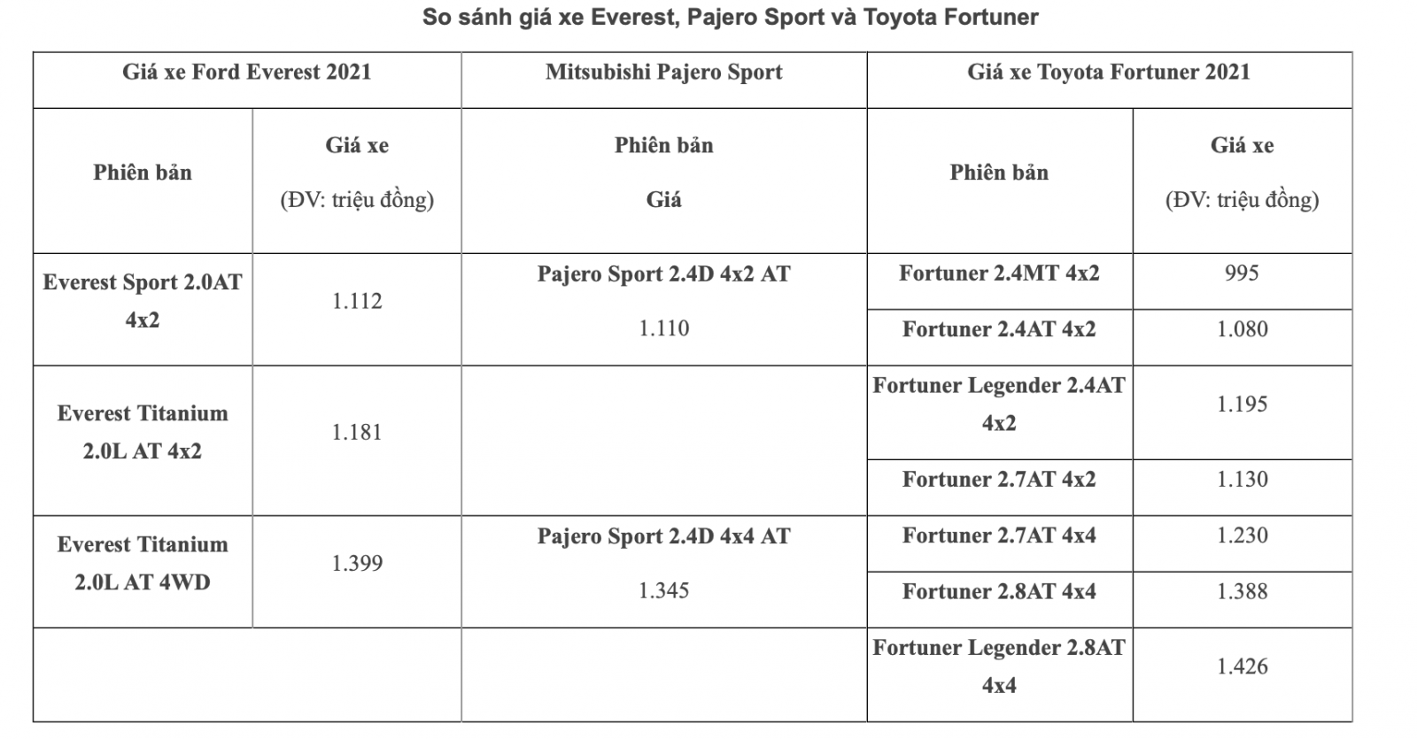 Ưu điểm của dòng xe này là máy khỏe, siêu tiết kiệm nhiên liệu. Fortuner dùng bộ dẫn động 4WD bán thời gian có khóa visai, chuyển cầu tuỳ ý (2H/4H/4H.L) đi kèm 03 chế độ công suất (Eco/Normal/Sport) còn Everest dùng 4WD toàn phần có khóa visai đi kèm các chế độ địa hình (Đô thị, cát, bùn, đá sỏi) tuỳ chọn. Sự khác biệt là ở chỗ Fortuner có thể chọn chạy 1 cầu (2H) cố định nếu không cần thiết phải tốn sức, tốn nhiên liệu, hao mòn cơ khí. Còn Everest thì 2 cầu luôn hoạt động với tỉ lệ phân chia lực kéo thay đổi tuỳ địa hình. Khi cần chủ xe Fortuner vẫn có lựa chọn chuyển cầu điện tử, 1 cầu sang 2 cầu nhanh hoặc chậm để đáp ứng Off-road, cũng tương tự như các chế độ địa hình của Ford.
