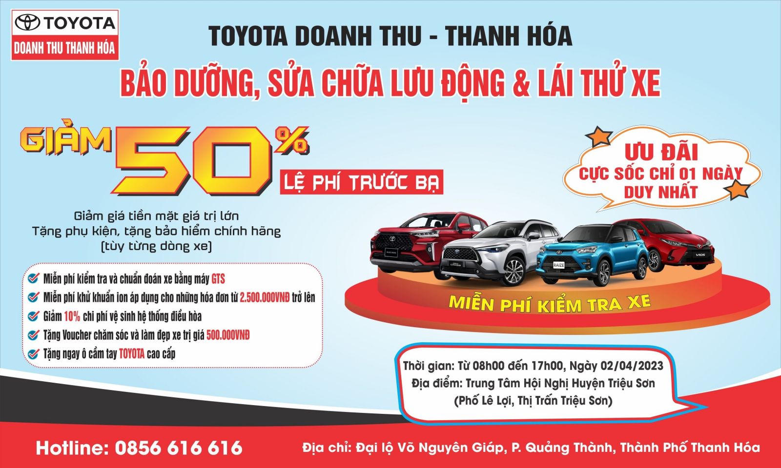 Nhằm tri ân và hỗ trợ Quý khách hàng tại huyện Triệu Sơn, Tỉnh Thanh Hóa. Toyota Doanh Thu- Thanh Hóa kính mời quý khách tham gia sự kiện “Bảo Dưỡng, Sửa Chữa Lưu Động & Lái Thử Xe tại Trung Tâm Hội Nghị Huyện Triệu Sơn (Phố Lê Lợi, Thị Trấn Triệu Sơn) vào lúc 08h00 đến 17h00, chủ nhật ngày 02/04/2023