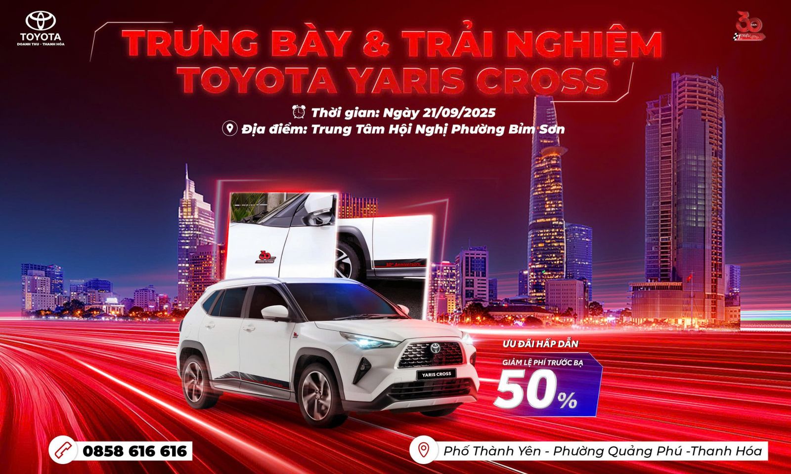 Đừng bỏ lỡ cơ hội sở hữu mẫu xe Toyota Yaris Cross yêu thích với giá tốt nhất cùng nhiều quà tặng giá trị. Hẹn gặp Quý khách hàng tại Trung Tâm Hội Nghị Phường Bỉm Sơn vào ngày 21/09/2025!