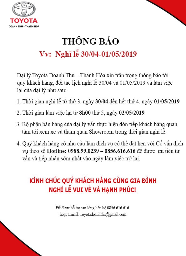 THÔNG BÁO NGHỈ LỄ 30/4 VÀ 01/5 NĂM 2019 - TOYOTA DOANH THU THANH HÓA