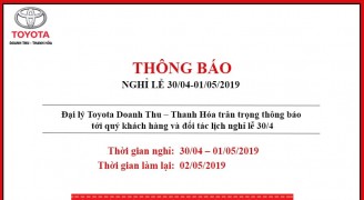 Đại lý TOYOTA DOANH THU - THANH HÓA xin trân trọng thông báo tới Quý khách hàng, đối tác lịch nghỉ lễ 30/4 - 1/5/2019 và thời gian làm việc trở lại.