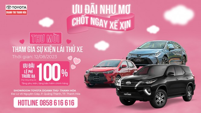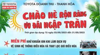 Nhằm tri ân sự tin tưởng và ủng hộ của Quý khách dành cho Toyota Doanh Thu- Thanh Hóa trong thời gian qua và với mục đích mang đến những dòng xe mới nhất cùng dịch vụ sửa chữa, bảo dưỡng xe chuyên nghiệp và tận tình theo tiêu chuẩn như tại xưởng đến với Quý khách ở các huyện xa, góp phần tạo điều kiện để khách hàng có cơ hội được trải nghiệm, lái thử và chăm sóc cho chiếc xe của mình một cách tốt nhất với chi phí hợp lý nhất