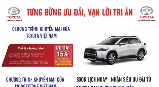 1: Chương trình ưu đãi từ Toyota Việt Nam (TMV) Giảm giá 15% dầu động cơ, phụ tùng bảo dưỡng và hao mòn tự nhiên 2: Chương trình Ưu Đãi từ Bridgestone Việt Nam Thay lốp Bridgestone nhận quà liền tay 3: Chương trình Ưu Đãi từ Toyota Doanh Thu- Thanh Hóa Miễn phí kiểm tra xe Miễn phí rửa xe Miễn Phí khử khuẩn