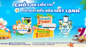 Chốt xe liền tay – Rước ngay điều hòa mát lạnh Điều kiện tham gia: Chương trình áp dụng cho khách hàng ký hợp đồng, thanh toán 100% giá trị hợp đồng và xuất hoá đơn từ ngày 11/06/2025 đến ngày 30/06/2025 với cơ cấu giải thưởng như sau: 01 Giải Nhất: Điều hòa Daikin 12000 BTU 02 Giải Nhì: Quạt điều hòa HA-8600 03 Giải Ba: Máy xay sinh tố ROLER RB-4142 10 Giải Khuyến Khích: Voucher phụ kiện trị giá 1 TRIỆU ĐỒNG