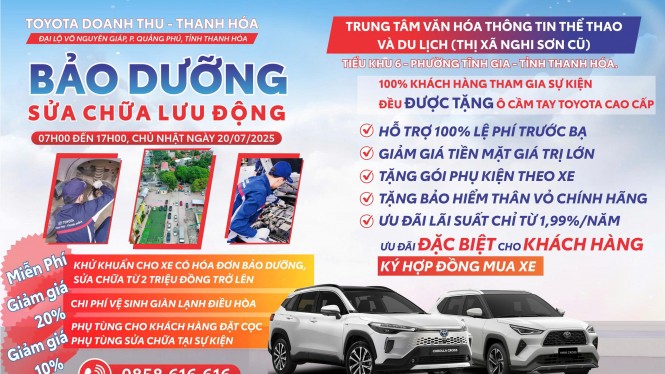 Toyota Doanh Thu - Thanh Hóa kính mời Quý khách hàng tham gia sự kiện bảo dưỡng, sửa chữa lưu động và lái thử xe tại Huyện Hoằng Hóa vào chủ nhật, Ngày 22/06/2025