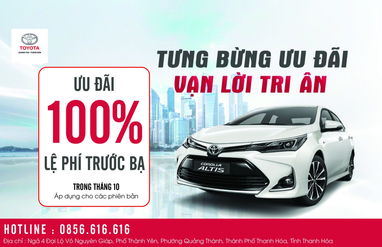 Nhằm tri ân sự tin yêu và ủng hộ của Quý khách hàng . Tháng 10 này, Toyota Doanh Thu- Thanh Hóa tung ưu đãi cho khách mua mẫu sedan hạng C Corolla Altis. Cả hai phiên bản 1.8G CVT và 1.8E CVT đều nhận mức ƯU ĐÃI 100% PHÍ TRƯỚC BẠ. Tổng gói ưu đãi lên tới gần 80 triệu đồng