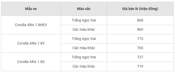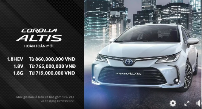 Hôm nay (9/3), Toyota Việt Nam chính thức giới thiệu chiếc Corolla Altis hoàn toàn mới. Xe sẽ có ba phiên bản 1.8G, 1.8V và 1.8HEV, giá từ 719 - 860 triệu đồng cùng tuỳ chọn 5 màu ngoại thất (Đỏ, Trắng ngọc trai, Xám, Bạc, Đen) và 2 màu nội thất (Đen, Be).