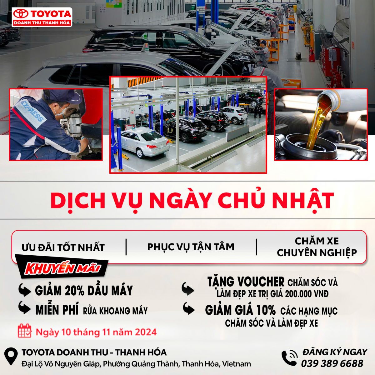 Chắc hẳn không ít lần bạn đau đầu vì cuối tuần mới có thời gian chăm sóc, bảo dưỡng xe nhưng lại không biết Đại lý chính hãng nào mở cửa làm dịch vụ vào ngày chủ nhật? Vậy thì giờ đây, bạn hoàn toàn yên tâm vì Toyota Doanh Thu- Thanh Hóa mở cửa làm dịch vụ tất cả các ngày CHỦ NHẬT trong tháng 11.2024 , tháng sinh nhật Toyota Doanh Thu - Thanh Hóa tròn 6 tuổi. Với chương trình khuyến mại lớn nhất trong năm bao gồm: