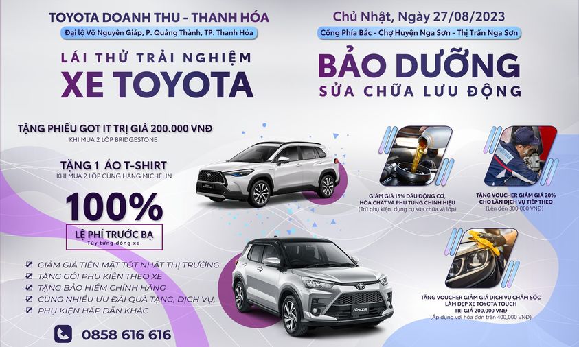 Nhằm tri ân sự tin tưởng và ủng hộ của Quý khách dành cho Toyota Doanh Thu- Thanh Hóa trong suốt 5 năm hình thành và phát triển, với mục đích mang lại cho khách hàng trải nghiệm các dòng xe mới nhất, HOT nhất của Toyota cùng dịch vụ sửa chữa, bảo dưỡng xe chuyên nghiệp và tận tình theo tiêu chuẩn như tại xưởng đến với Quý khách ở các huyện xa, góp phần tạo điều kiện để khách hàng có cơ hội được trải nghiệm, lái thử và chăm sóc cho chiếc xe của mình một cách tốt nhất với chi phí hợp lý nhất