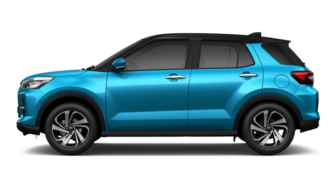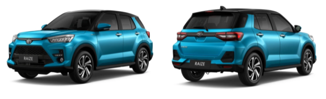 Ở ngoại thất, Raize có hai điểm nhấn chính là hệ thống đèn "full" LED kèm bộ mâm 17 inch 5 chấu kép dạng phay. Sơn xe được phối theo kiểu hai tông màu với nóc đen và thân xe là màu khác, hiện chưa rõ là mặc định hay tùy chọn.