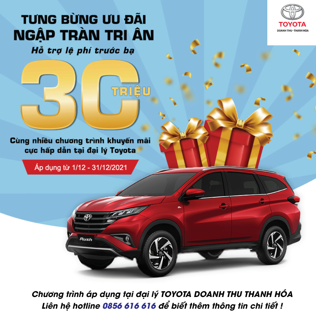 Toyota Doanh Thu- Thanh Hóa tiếp tục duy trì ưu đãi đối với mẫu xe Rush là hỗ trợ 30 triệu đồng lệ phí trước bạ đối với khách hàng ký hợp đồng và thanh toán 100%. Còn đối với khách hàng mua trả góp, TFS cùng với gói vay lãi suất thấp, thủ tục đơn giản nhanh chóng, theo đó chỉ cần trả trước khoảng 127 triệu đồng là có thể vi vu lái xe về nhà. Điều này nhằm mục đích kích cầu mua sắm dịp cuối năm khi nhu cầu xe hơi để đón tết du xuân nhiều hơn, đồng thời giúp hiện thực hóa giấc mơ sở hữu ô tô của không ít người dân Việt Nam.