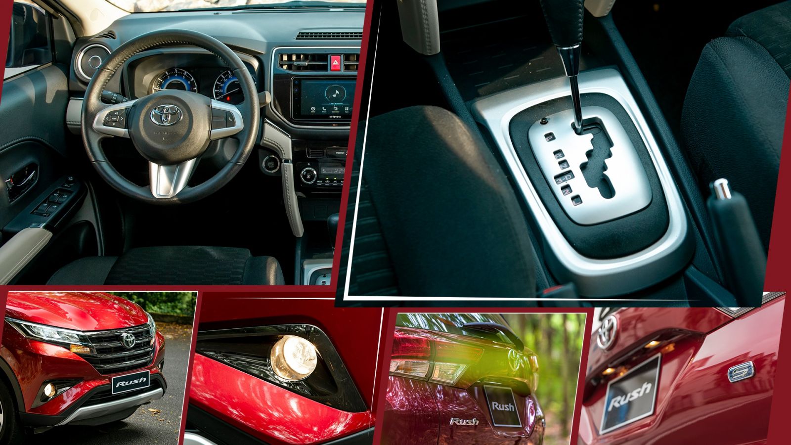 Ở bên ngoài, Toyota Rush được hệ thống đèn trước/sau bằng LED, mâm 17 inch thiết kế 5 chấu kép dạng xoáy thể thao, ăng-ten dạng vây cá, cánh gió mui tích hợp đèn phanh. Các trang bị đáng chú ý trong xe gồm vô-lăng 3 chấu tích hợp nút chức năng, màn hình thông tin giải trí cảm ứng kích thước 7 inch kết nối điện thoại thông minh, dàn âm thanh 8 loa...