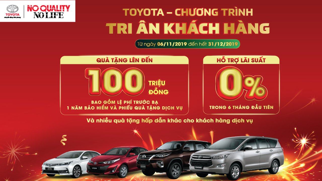 Ưu đãi lên tới 100 triệu đồng bao gồm hỗ trợ lệ phí trước bạ, 1 năm bảo hiểm thân vỏ Toyota, phiếu dịch vụ miễn phí, dành cho khách hàng mua xe Vios (tất cả các phiên bản), Corolla Altis (tất cả các phiên bản), Fortuner 2.4 AT 4x2 (FK), Fortuner 2.4 MT 4x2 (FG), Innova E 2.0 MT (IE&IEB) và hoàn tất thủ tục thanh toán 100% giá trị mua xe trong thời gian từ 6/11/2019 đến 31/12/2019.