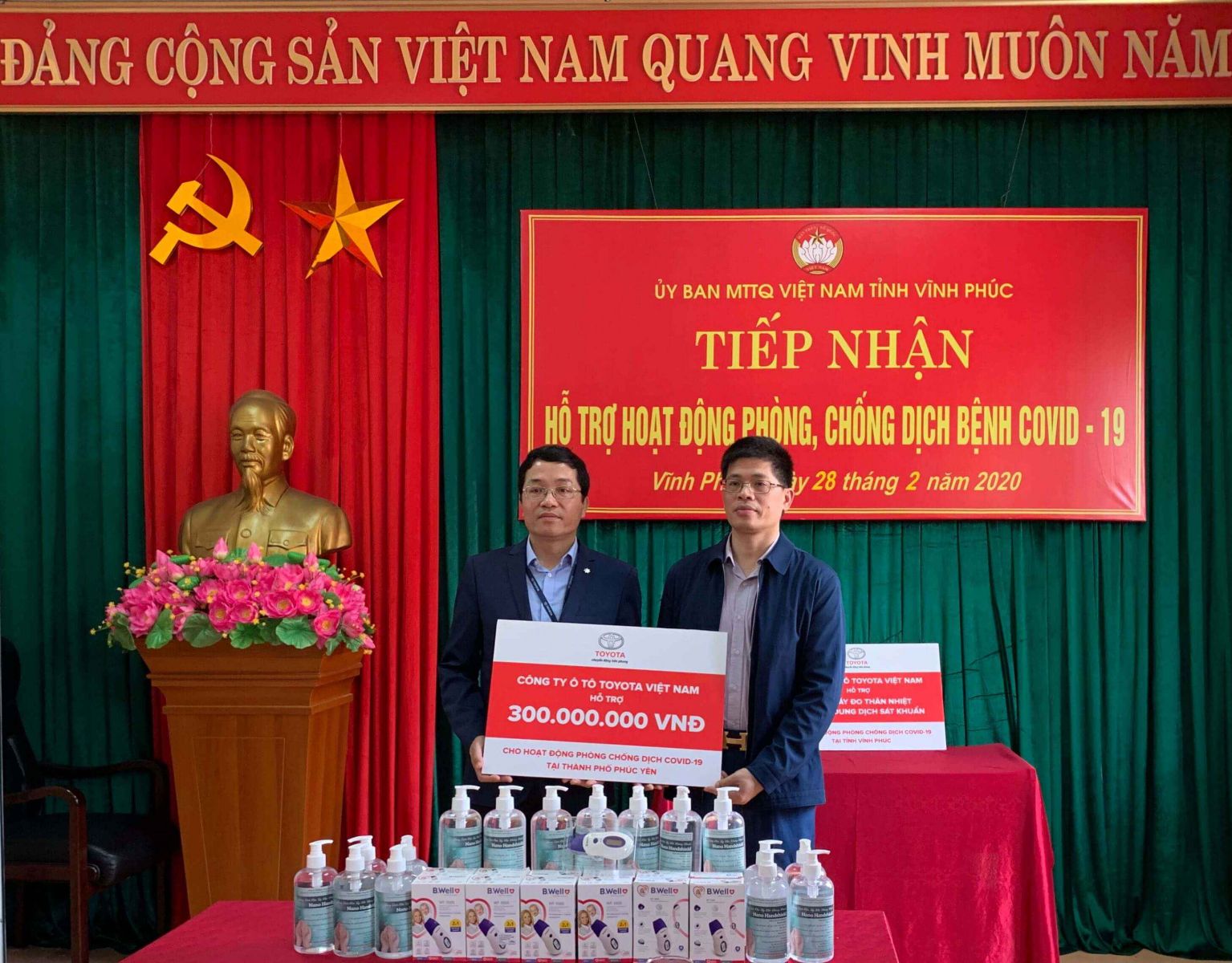 Là doanh nghiệp hoạt động trên địa bàn Tỉnh Vĩnh Phúc, bên cạnh nỗ lực mang lại những sản phẩm và dịch vụ với chất lượng tốt nhất cho khách hàng, TMV luôn hướng tới mục tiêu “trở thành công dân tốt trong cộng đồng sở tại” cũng như đồng hành cùng sự phát triển của đất nước Việt Nam và sự ấm no của người dân nơi đây. Nhận thấy những ảnh hưởng của dịch bệnh lên đời sống người dân địa phương, TMV quyết định ủng hộ các trang thiết bị y tế bao gồm 400 máy đo thân nhiệt hồng ngoại, 500 lít dung dịch sát khuẩn cho tỉnh Vĩnh Phúc và trao tặng số tiền 300 triệu đồng cho thành phố Phúc Yên, tỉnh Vĩnh Phúc nhằm hỗ trợ công tác phòng chống dịch bệnh. Buổi lễ trao tặng diễn ra vào ngày 28/02/2020 tại Ủy ban Mặt trận Tổ quốc Việt Nam tỉnh Vĩnh Phúc với sự tham gia của Ông Nguyễn Tuấn Khanh – Chủ tịch Ủy ban Mặt trận Tổ quốc Việt Nam tỉnh Vĩnh Phúc, Ông Tôn Mạnh Cường – Phó Chánh văn phòng UBND Thành phố Phúc Yên, Tỉnh Vĩnh Phúc, Ông Phạm Thanh Tùng – Phó Tổng Giám đốc Công ty Ô tô Toyota Việt Nam và các cơ quan báo chí địa phương. TMV hy vọng rằng hoạt động này sẽ góp phần hỗ trợ nhân dân trong Tỉnh ngăn ngừa và đẩy lùi các nguy cơ lây nhiễm do virus Covid-19 gây ra.