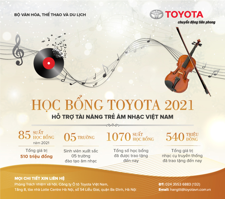 Công ty Ô tô Toyota Việt Nam phối hợp với Bộ Giáo dục & Đào tạo, Bộ Văn hóa, Thể thao & Du lịch tiến hành trao Học bổng Kỹ thuật Toyota cho sinh viên các trường đại học ngành kỹ thuật và Học bổng Toyota hỗ trợ tài năng trẻ âm nhạc Việt Nam năm 2021.