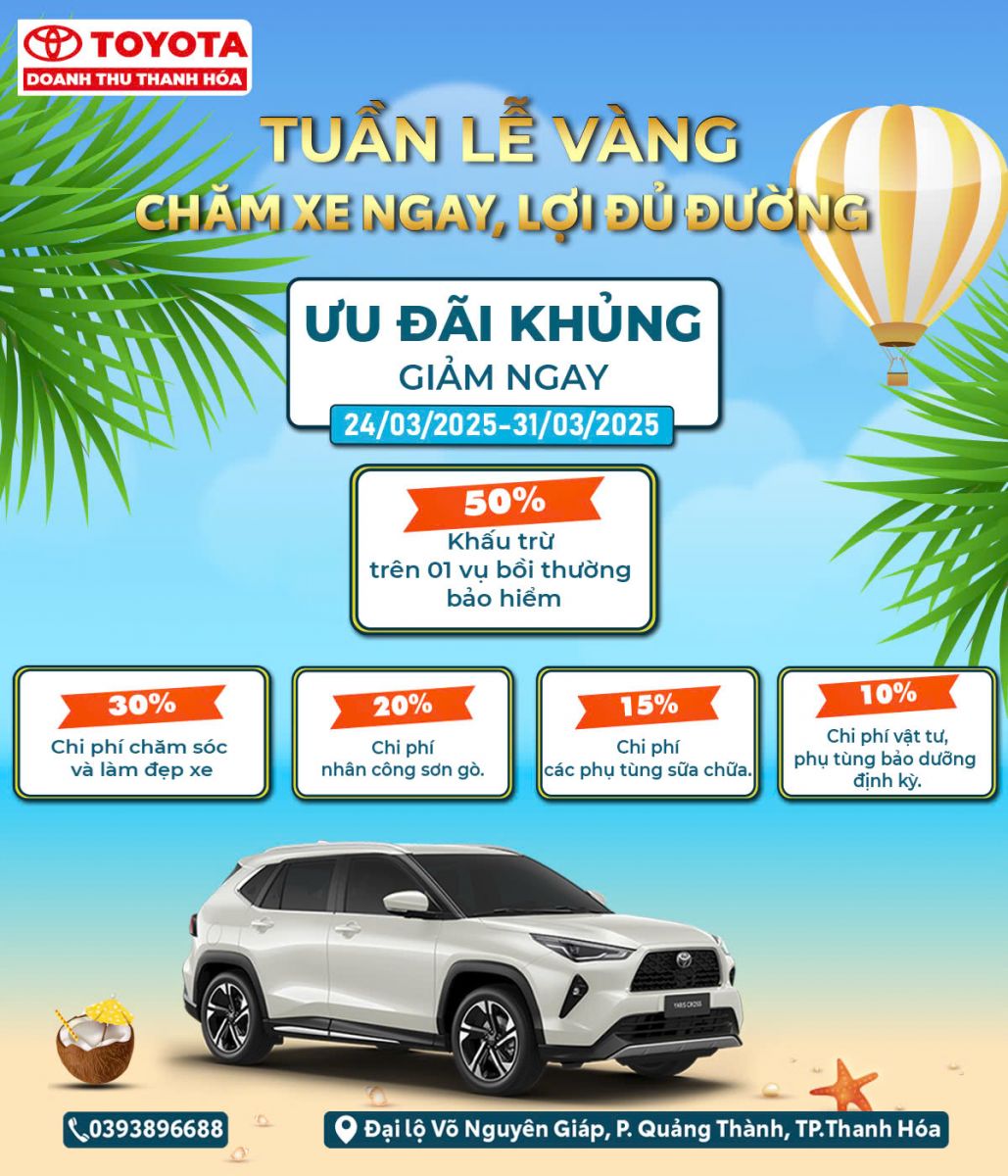 Khách hàng sử dụng bảo hiểm tại Toyota Doanh Thu - Thanh Hóa sẽ được giảm 50% khấu trừ trên 1 vụ bồi thường (áp dụng cho những xe xuất hóa đơn từ ngày 24/03/2025 - 31/03/2025).