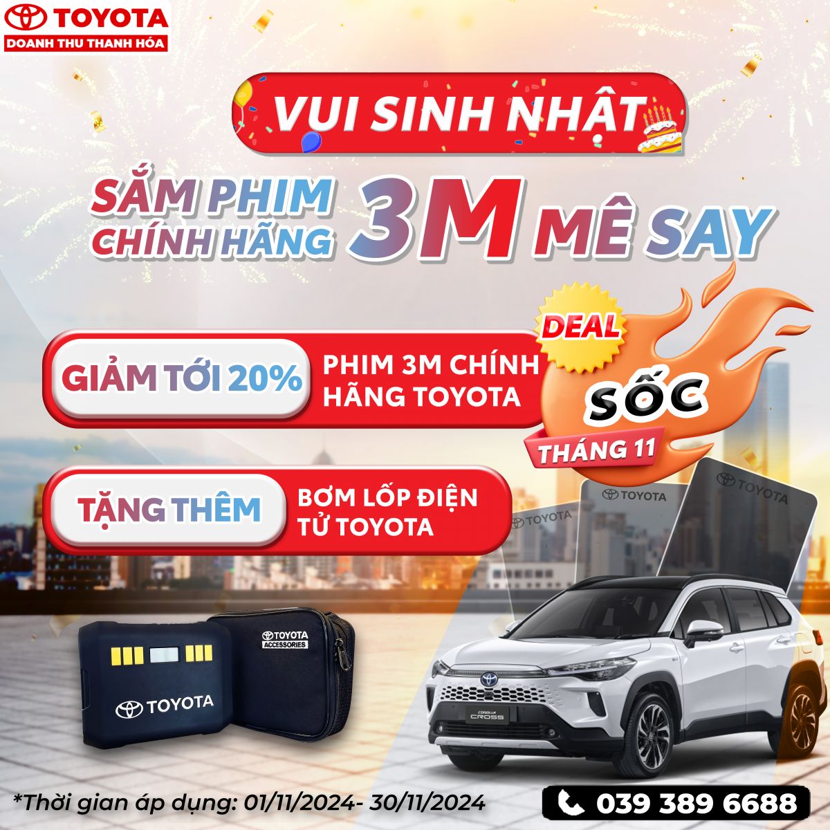 Vui sinh nhật- sắm phim 3M chính hãng mê say khi được giảm giá lên tới 20% và còn được tặng thêm bơm lốp điện tử Toyota chính hãng