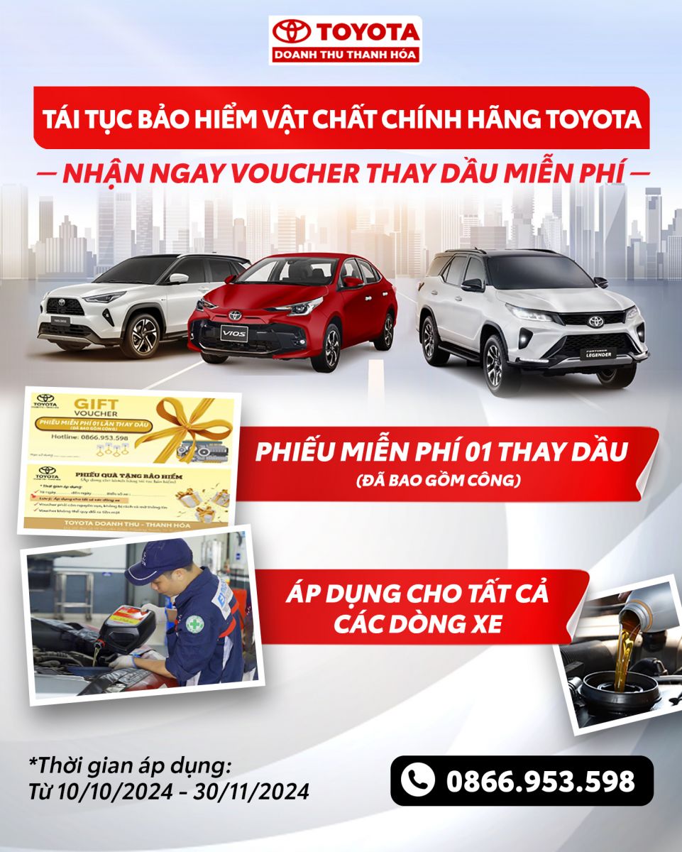 Chưa hết, với những khách hàng tham gia tái tục bảo hiểm trong tháng sinh nhật Toyota Doanh Thu- Thanh Hóa sẽ được tặng Voucher thay dầu miễn phí.