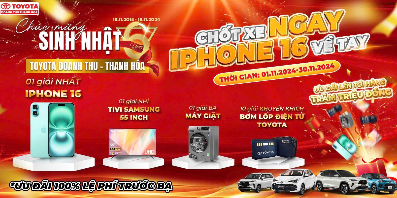 Nhân dịp sinh nhật lần thứ 6, Nhằm tri ân tất cả khách hàng đã tin yêu, Toyota Doanh Thu Thanh Hóa triển khai chương trình đại tiệc bốc thăm trúng thưởng với hàng ngàn ưu đãi quà tặng, tiền mặt, phụ kiện, bảo hiểm, dịch vụ lên tới hàng trăm triệu đồng.
