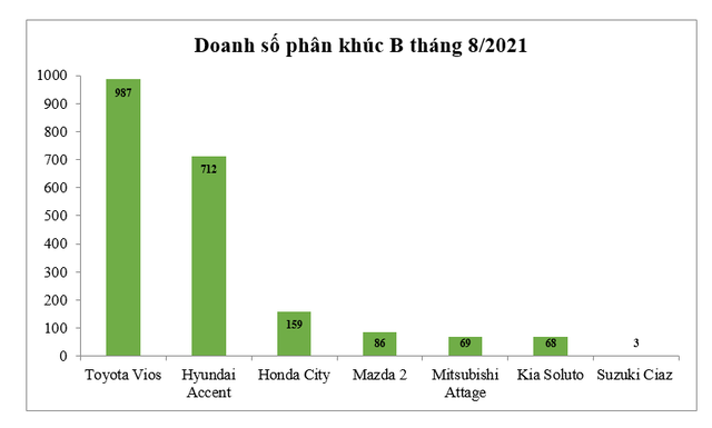 Tháng 8/2021 ghi nhận doanh số bán hàng của ngành ô tô thấp nhất kể từ năm 2015 với chỉ gần 9.000 xe (bao gồm xe du lịch, thương mại và xe chuyên dụng), giảm tới gần 50% so với tháng 7 và gần 60% so với cùng kỳ năm 2020, đặc biệt có tới gần 200 đại lý không thể hoạt động do giãn cách phòng chống COVID-19. Nhiều hãng cũng đã phải hoãn kế hoạch ra mắt mẫu xe mới cũng như tạm dừng sản xuất bởi lượng xe tồn kho khá lớn trong khi các đại lý vẫn chưa thể hoạt động trở lại. Mặc dù vậy, tháng 8 cũng cho thấy mẫu xe "quốc dân" Toyota Vios vẫn giữ được sức hút với khách hàng khi có tới 987 xe được bán ra, doanh số cộng dồn đạt 11.955 xe, tiếp tục đứng đầu phân khúc sedan hạng B toàn thị trường. Điều này phản ánh sự tín nhiệm của người tiêu dùng dành cho Vios khi họ cần một chiếc xe thực dụng phù hợp với thời cuộc hiện nay.
